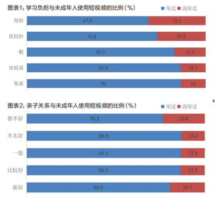 然后,調查發現,未成年人使用短視頻大多缺少父母親人陪伴,學業負擔很重、親子關系很不好的未成年人得到的陪伴最少;而有家人陪伴的未成年人使用短視頻頻率更低、時間更短。