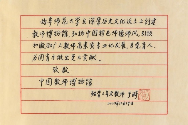 離開家中前,邢光表示于漪先生受聘榮譽(yù)館長是博物館發(fā)展中的標(biāo)志性事件,將激勵全校師生進(jìn)一步辦好孔子家鄉(xiāng)大學(xué)、建好國家級師德教育基地,努力創(chuàng)造新的成績,不辜負(fù)先生的厚望,并由衷地祝福先生身體康泰、吉祥如意。