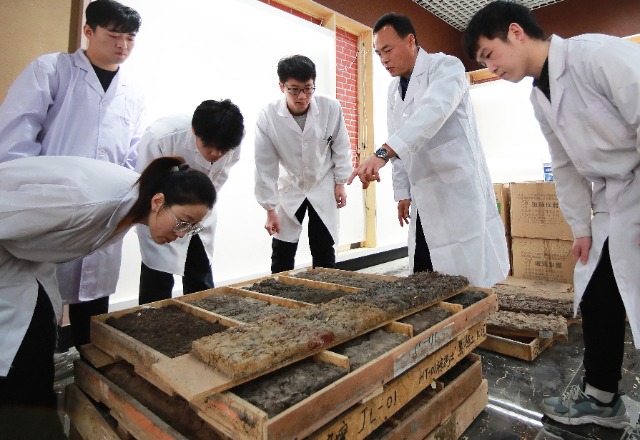 沈陽農(nóng)業(yè)大學(xué)農(nóng)業(yè)農(nóng)村部東北耕地保育重點(diǎn)實(shí)驗(yàn)室,鄒洪濤教授(右二)為研究生講授國家第三次土壤普查中診斷標(biāo)本制作過程。