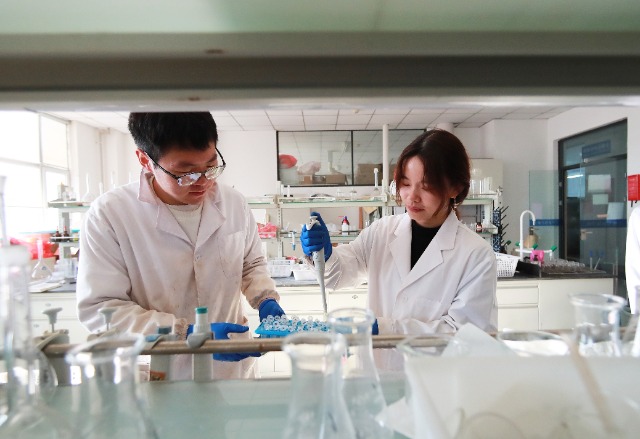 沈陽農(nóng)業(yè)大學(xué)土肥高效利用國家工程研究中心,碩士研究生石佳悅(右)、馬連勝團(tuán)結(jié)協(xié)作做土壤分子生物學(xué)試驗(yàn)。
