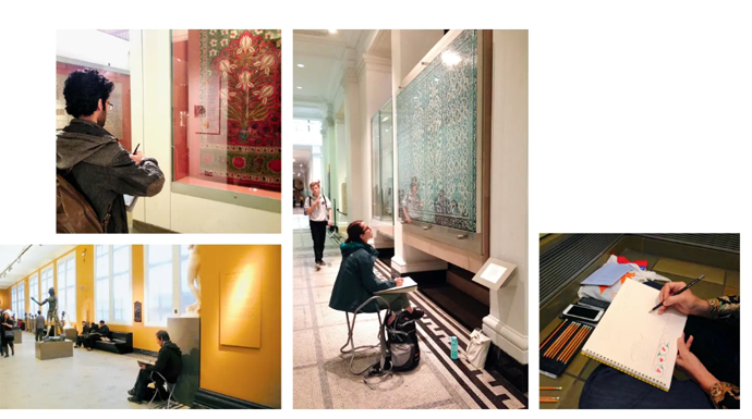 在現場選取臨摹對象時,我再次將學生未來會在學院學習的各種實踐專業課融入博物館藏品中,要求每位學生至少選取3種與專業課相關的媒介作為臨摹對象,如中東細密畫、陶瓷、雕刻、地毯等,在設計、比例、色彩、材質、制作方法、歷史背景、關聯性等方面將自己對傳統藝術的興趣點串聯起來并明確思路,臨摹時著重記錄自己的反思性思考,并在下午4點集合進行小組展示和討論。