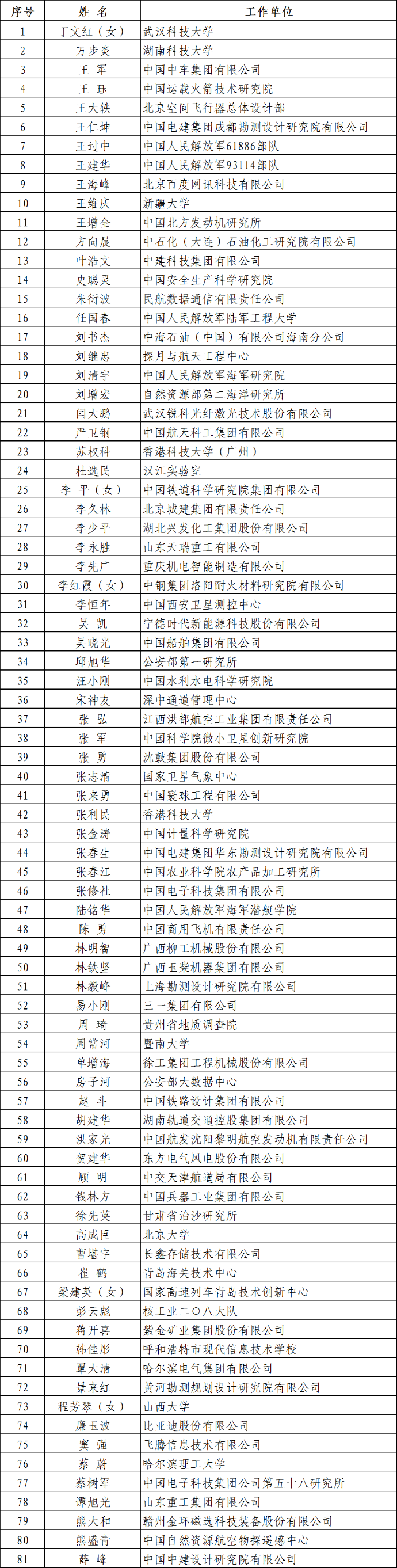 國(guó)家卓越工程師(81人)