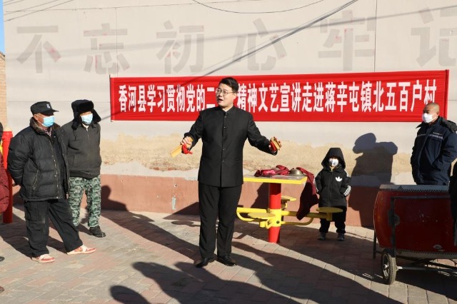 河北省香河縣文化館的文藝工作者張鑫銘在香河縣蔣辛屯鎮北五百戶村進行黨的二十大精神“快板宣講”(2022年12月13日攝)。新華社發
