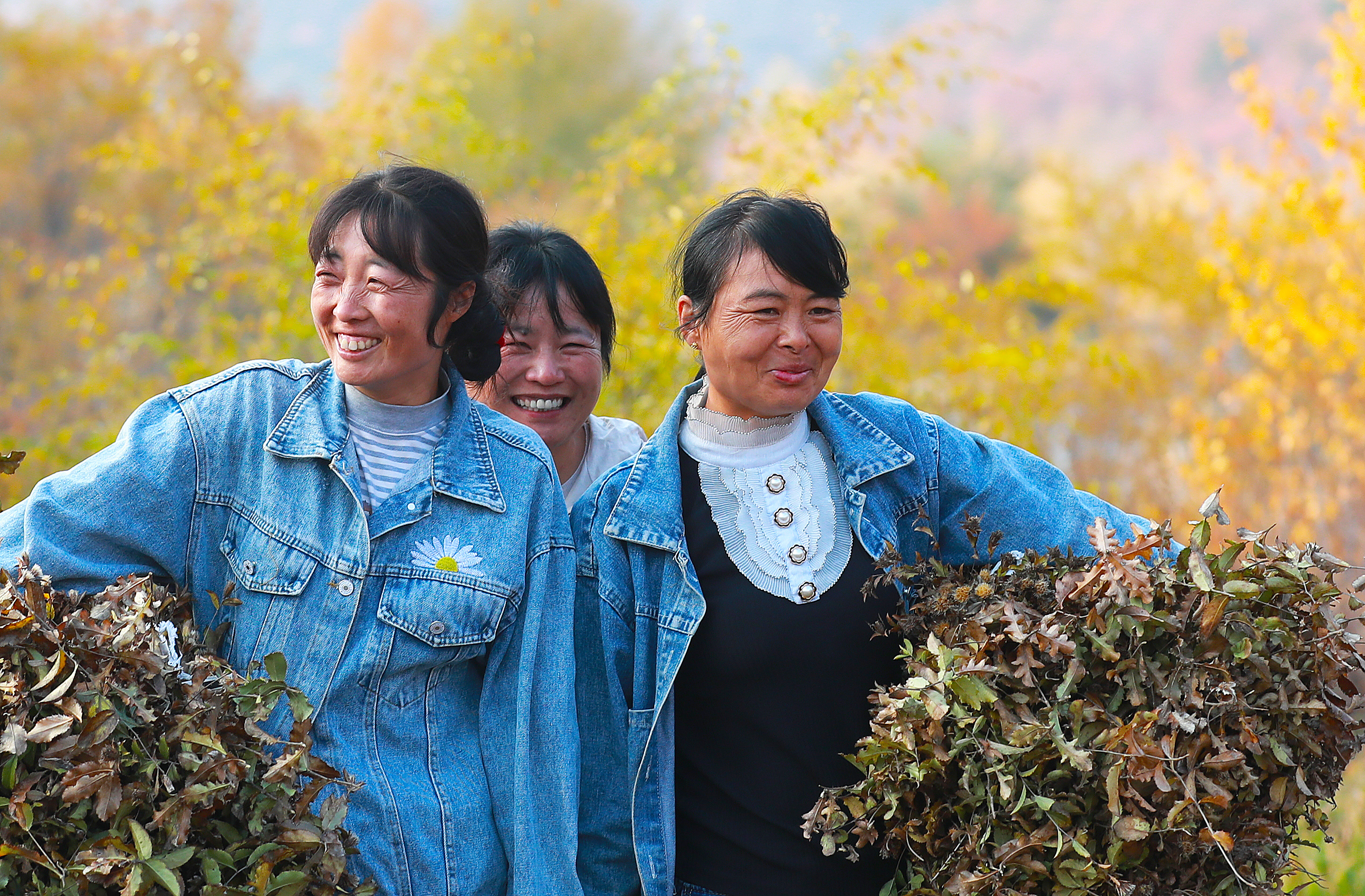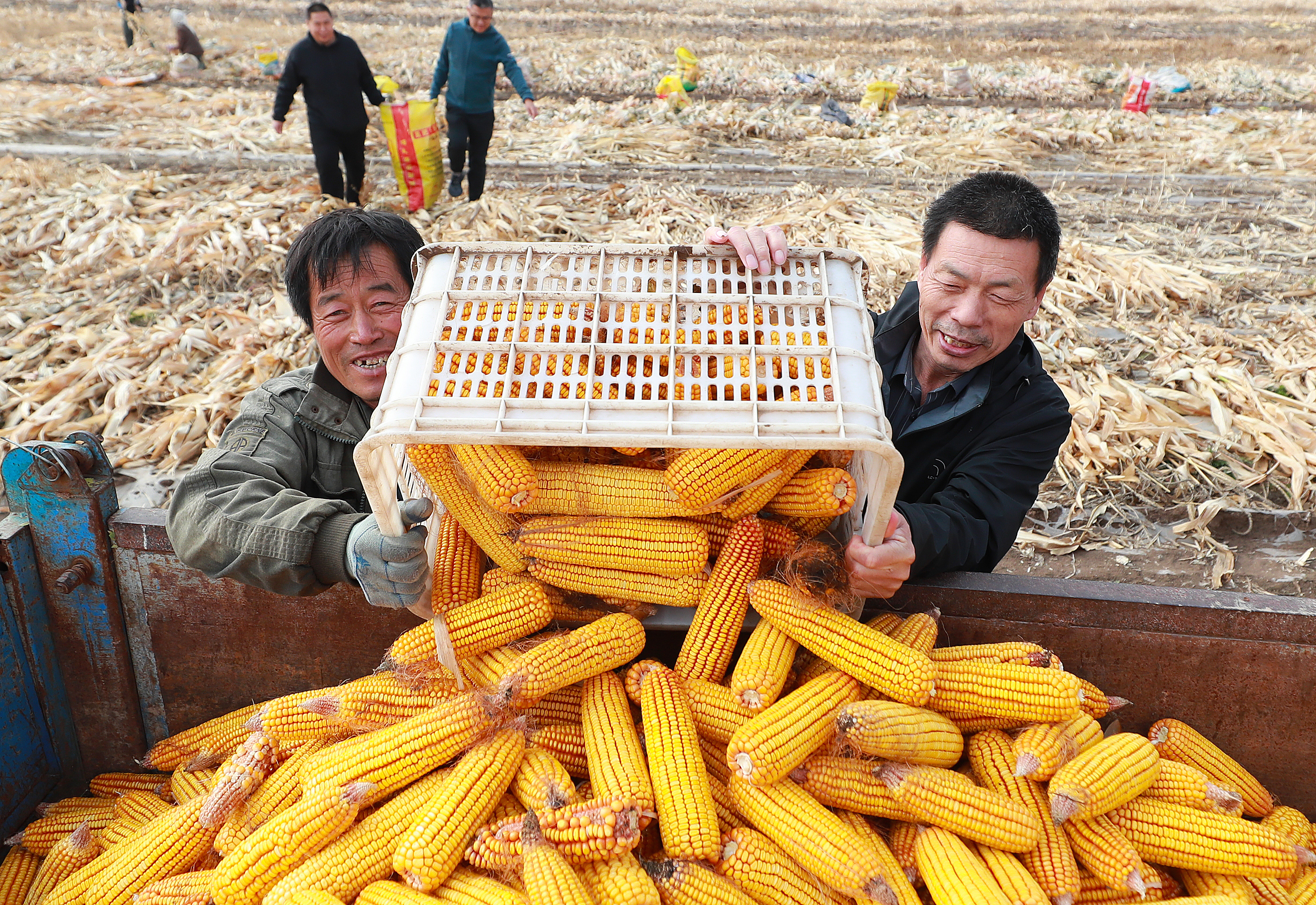 燕山大學(xué)駐來(lái)太溝村工作隊(duì)第一書(shū)記常順利(前右)正帶領(lǐng)隊(duì)員幫助農(nóng)戶岳樹(shù)軍家收玉米。