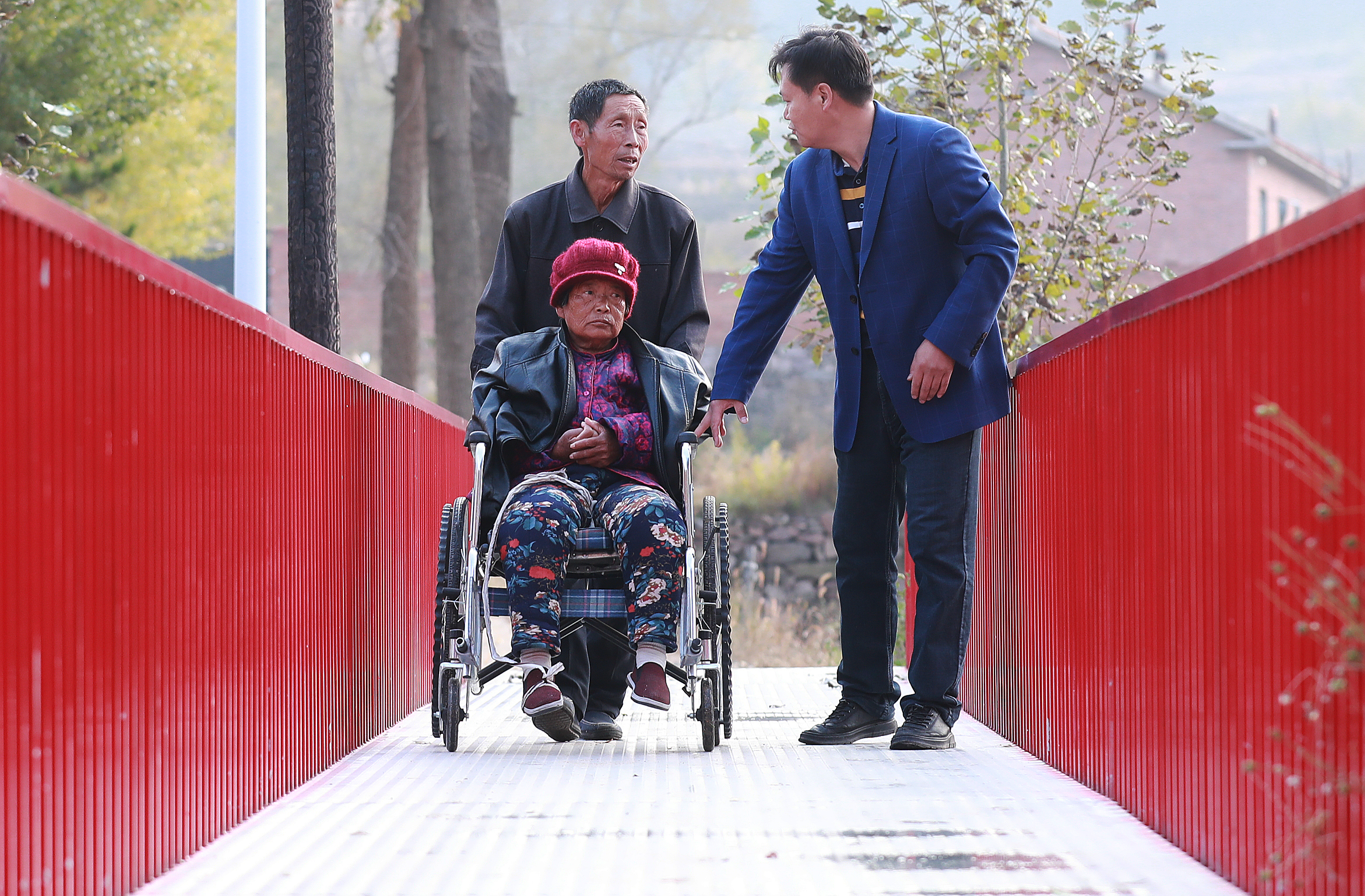 燕山大學(xué)駐銀里村工作隊(duì)現(xiàn)任第一書(shū)記馬巨海(右)在便民橋上了解村民梁瑞云生活情況。