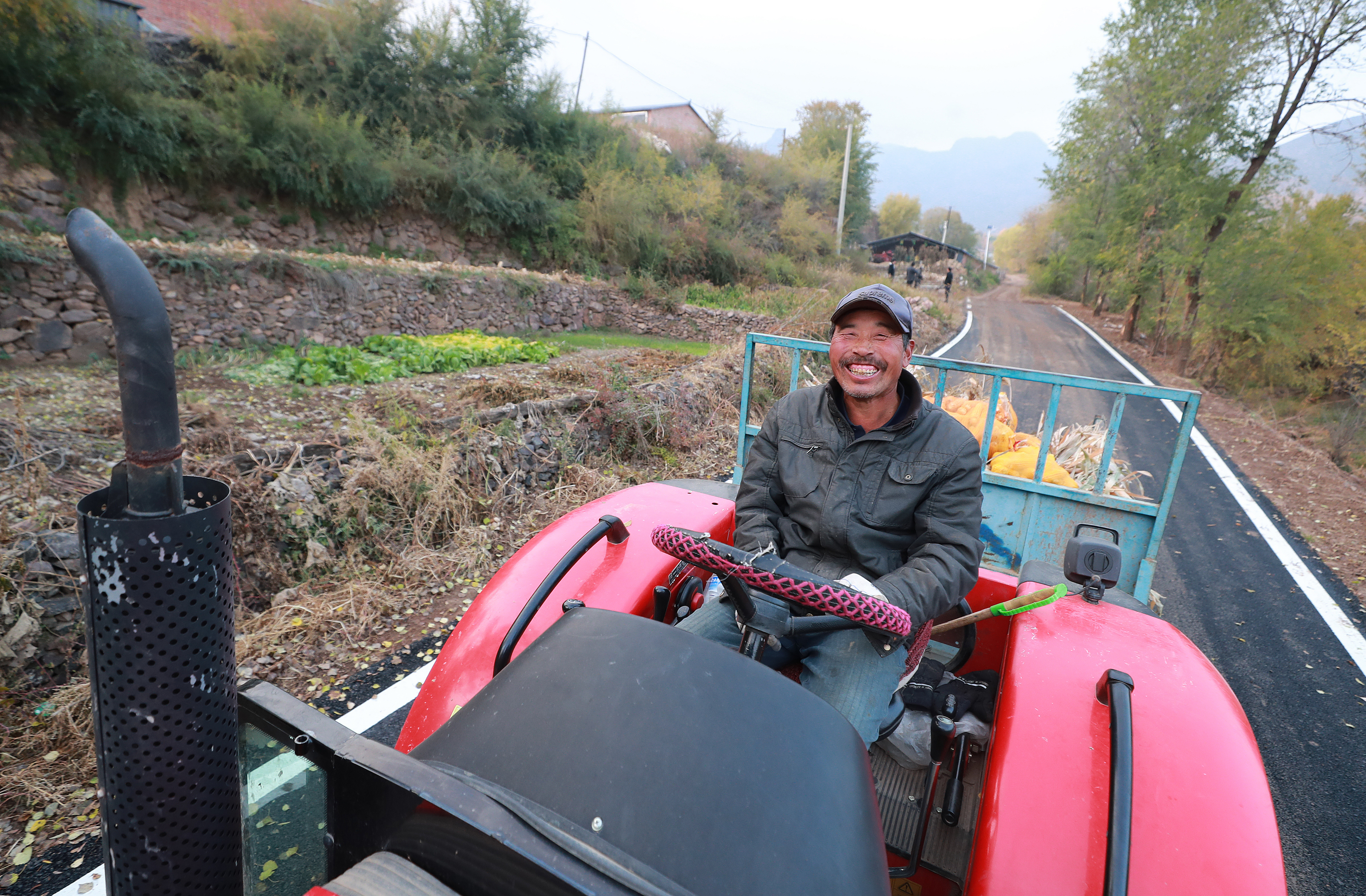 馬連道村白改黑項(xiàng)目竣工后,村民趙會(huì)龍駕駛拖拉機(jī)行駛在新鋪的柏油路上。