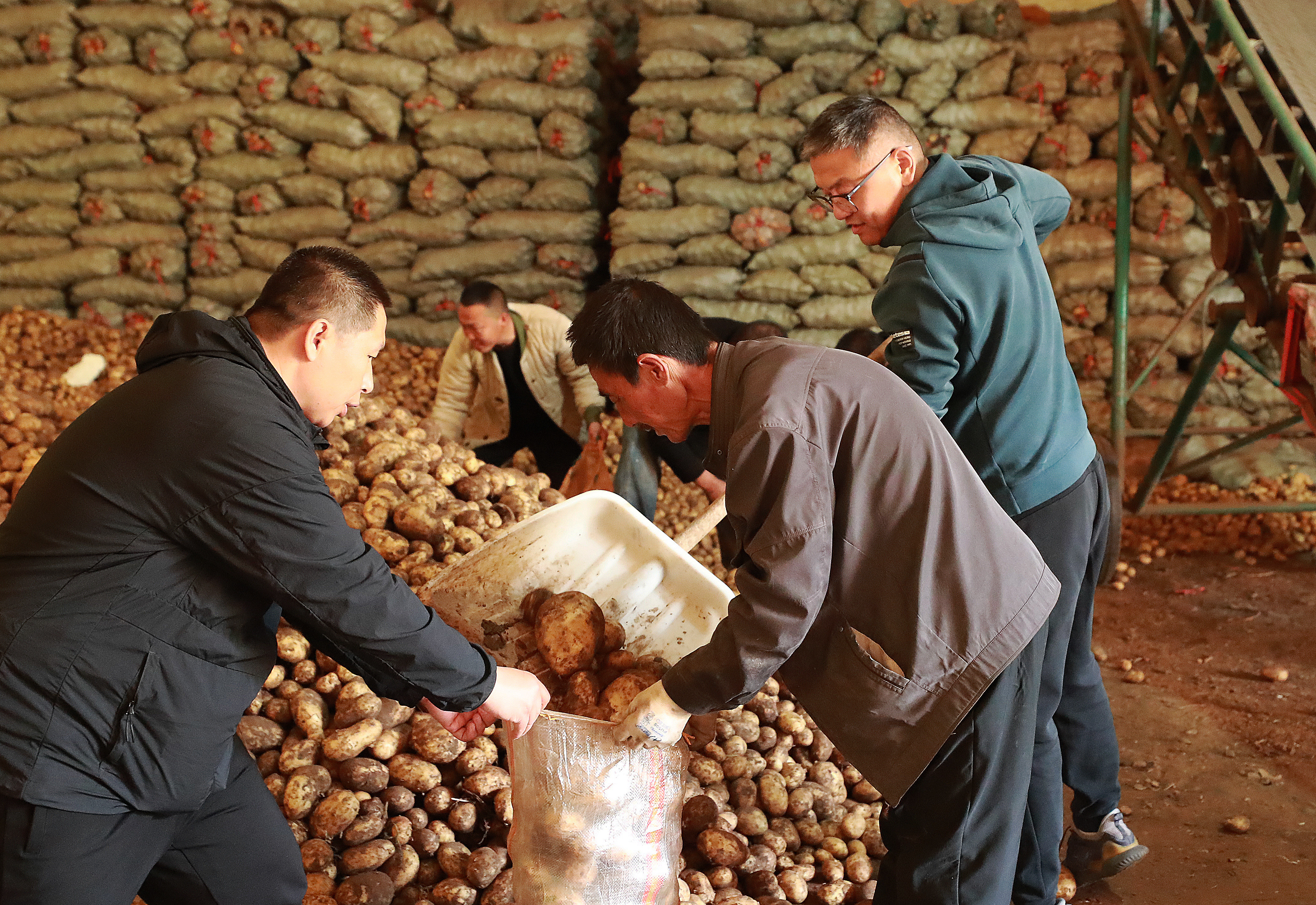 燕山大學(xué)駐來(lái)太溝村工作隊(duì)隊(duì)員在該村陳玉虎的馬鈴薯干洗車(chē)間邊幫忙邊了解情況。
