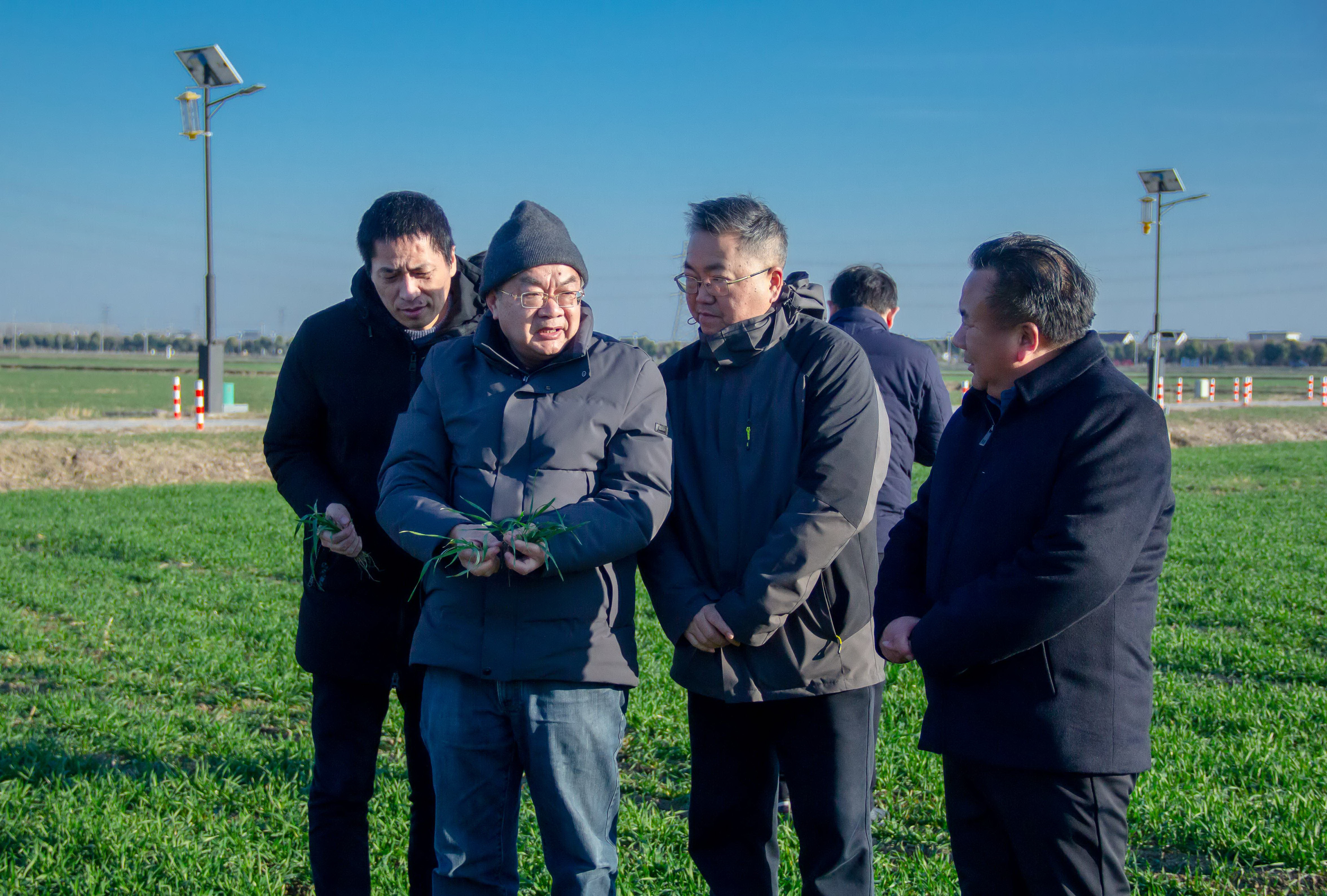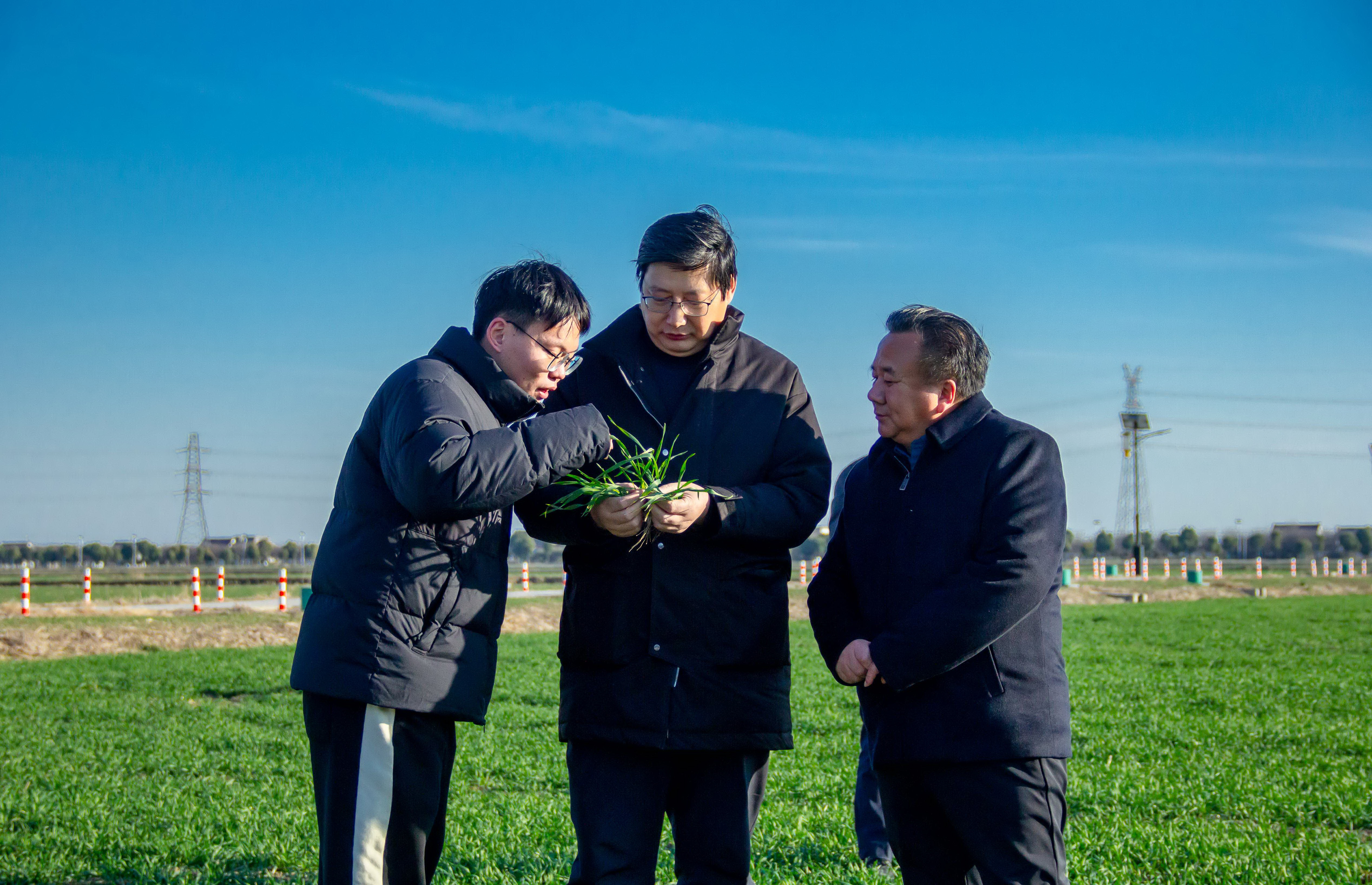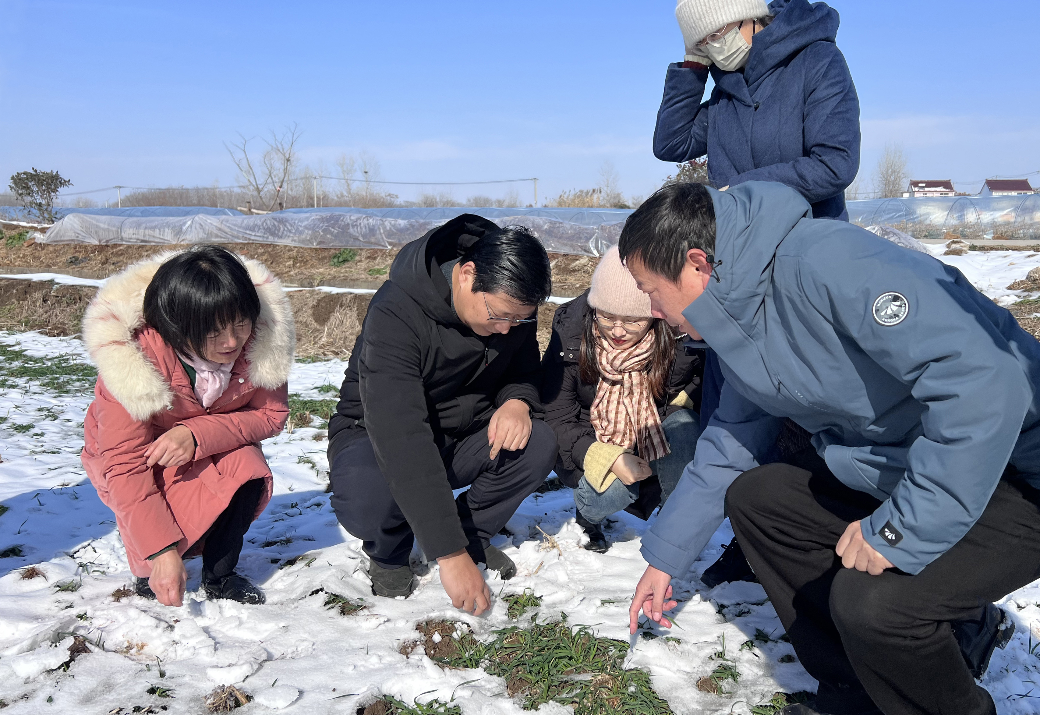 日前,朱新開(左二)帶領師生到儀征市小麥綠色高質高效創建示范方開展小麥雨雪冰凍災害防范指導服務。