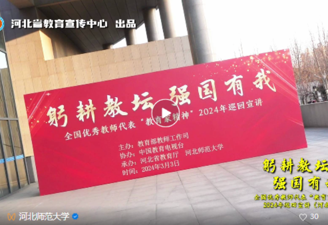 3月3日,教育家精神2024年巡回宣講活動走進河北。宣講會現場,6位宣講團成員通過自身的執教經歷,講述了他們躬耕教壇、無私奉獻的感人故事。本場巡回宣講采用“線上+線下”“主會場+分會場”形式進行。千余人在主會場聆聽報告。各市、縣(市、區)教育行政部門班子成員、相關學校師生代表共2.6萬余人在375個分會場收看。130余萬人通過直播同步收看。