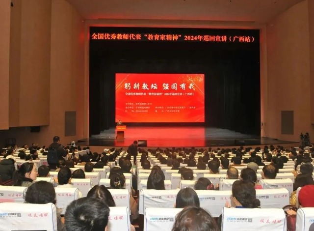 3月3日,教育家精神2024年巡回宣講活動走進廣西。全國6位宣講團成員作為代表開展教育家精神宣講,講述了自身在教育事業中的故事和感悟,用自己耕耘教育的親身實踐,生動詮釋了教育家精神,為全區師生展示了優秀教師代表的榜樣力量,激勵大家在自己的領域中不斷發揚光大、創造輝煌。