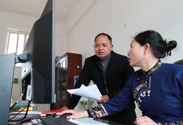 2月26日,農加貴就即將提交的建議,征求全國政協委員、廣南縣城區第四小學校長龔健梅(右)的意見。