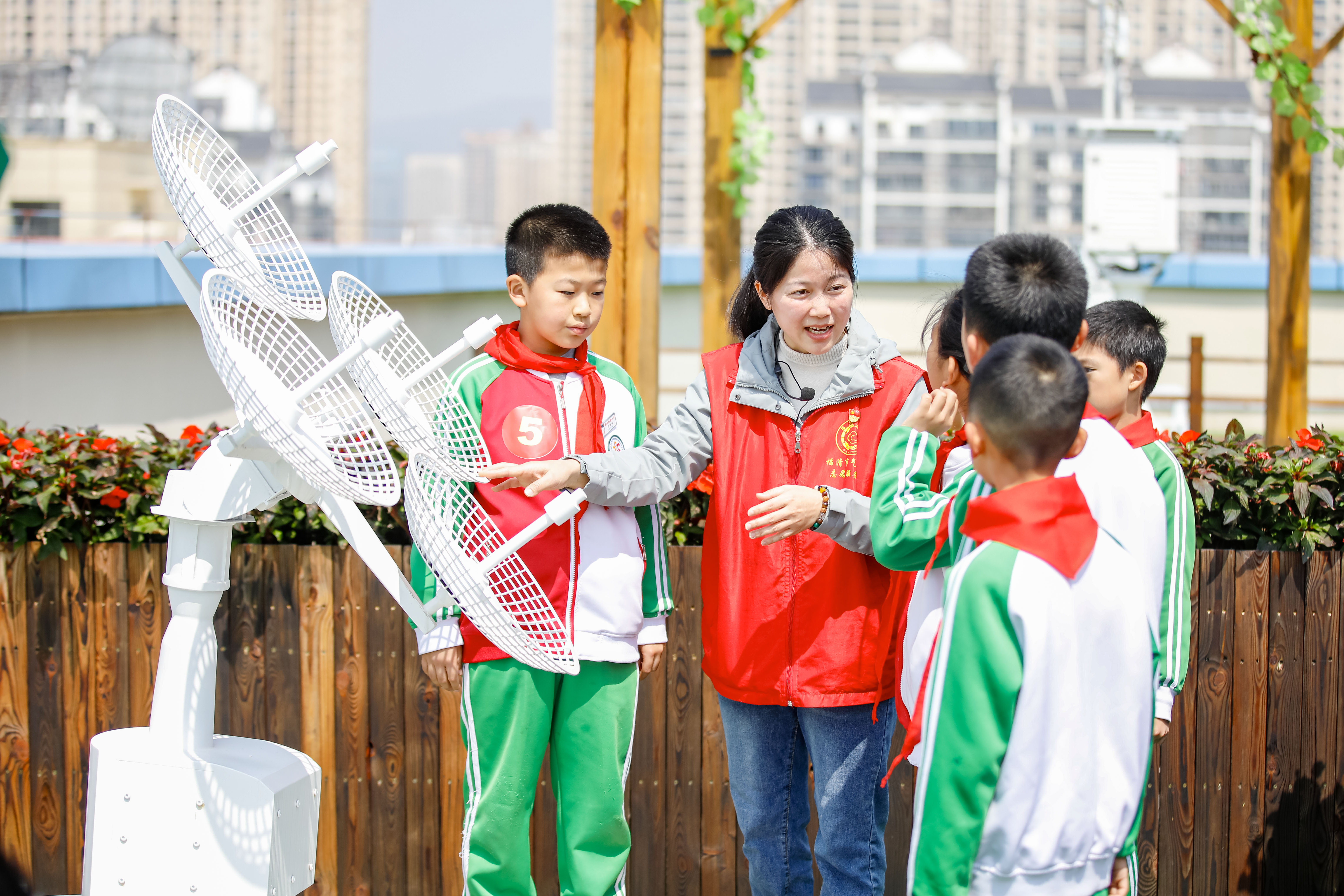氣象工作志愿者正在給孩子們講解探空雷達的有關氣象知識。通訊員 謝貴明 攝