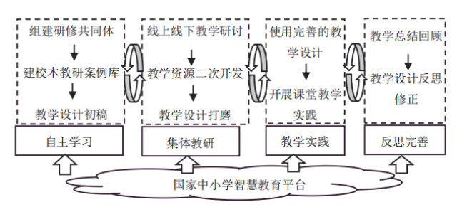 平臺支持的校本研修應用包含自主學習、集體教研、教學實踐、反思完善四個主要環節。以學科組為單位組建的校本研修共同體,根據教學實際需求分析平臺資源,搭建校本教研案例庫,組織教師自主學習。在自主學習與形成初步教學設計方案的基礎上,共同體進行線上線下集體研討,形成研磨后的集體教學設計方案。教師根據集體形成的教學方案進行個性化完善,開展教學實驗,進行教學反思,校本研修活動發揮了全過程、可視化的研修評價功能,有針對性地解決日常教學中出現的問題。