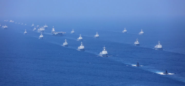 2018年4月12日,中央軍委在南海海域隆重舉行海上閱兵。這是航母打擊作戰群等接受檢閱。新華社發(莫小亮攝)