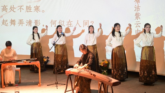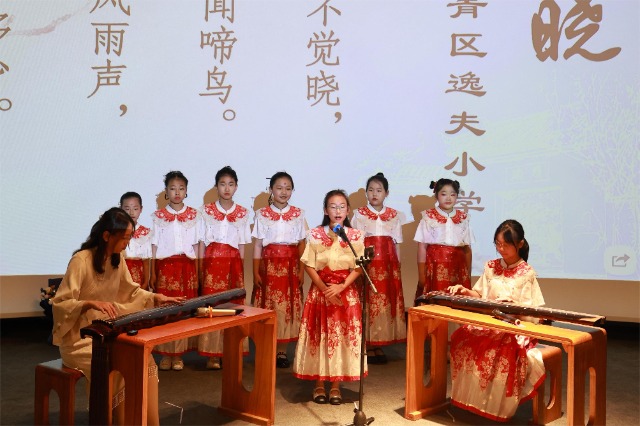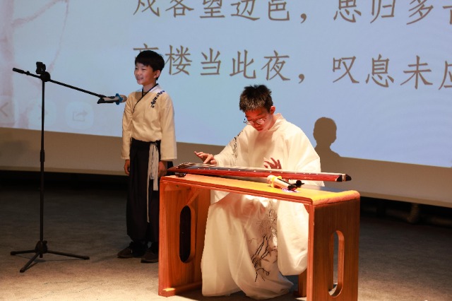 頭戴珠玉,漢服為裳,左琴右書。來自西青逸夫小學的小學生們在“江南好,風景舊曾諳”的詞句吟誦中盡顯古風之姿。來自濱海新區塘沽紫云中學的中學生們以古琴、古箏為伴奏,時而手鞠明月、時而仰頭高吟,表現出“大江東去,浪淘盡,千古風流人物”的豪放氣概。天津城建大學煦園琴社成員與來自摩洛哥籍留學生共同演繹《但愿人長久》,唱詞溫柔,余音繞梁,表現出“但愿人長久,千里共嬋娟”的思念之情。以詩詞為線索,師生們穿越古今,共同領略中華優秀傳統文化的詞意之美。在中華優秀傳統文化的浸潤下,跨學段、跨學齡地奉上一次異彩紛呈的“大中小學思政課一體化”活動。