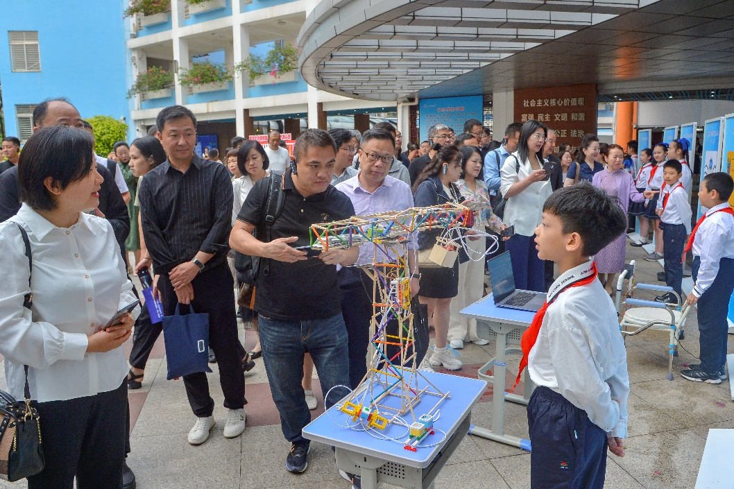 研討活動開始前,與會者一起到南寧市濱湖路小學現場觀摩了科創教育成果。沙漠移動水廠、嬰兒自動哄睡床等“奇思妙想”,“我和紙的故事”紅豆挑戰賽,“雞蛋撞地球”比輕、拋石機攻城等科技運動會比賽項目展示,以及“AI人工智能對人類的發展利大于弊還是弊大于利”校園辯論……孩子們自信大方、敢于創新的表現贏得了大家的紛紛點贊。