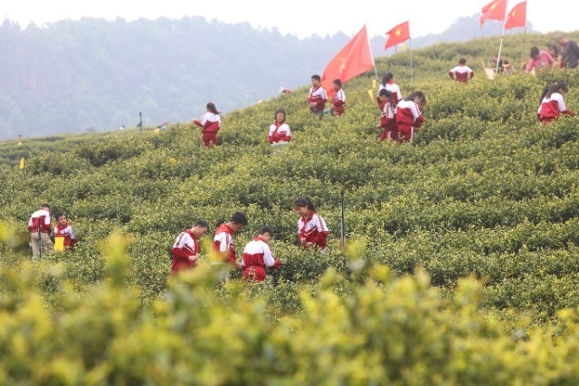 江西省吉安市泰和縣馬市鎮(zhèn)中心小學(xué)學(xué)生在甘露村生態(tài)茶園體驗(yàn)采茶活動(dòng),享受春日勞動(dòng)樂趣。鄧和平 攝