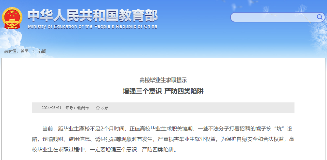 當前,距畢業生離校不足2個月時間,正值高校畢業生求職關鍵期,一些不法分子打著招聘的幌子挖“坑”設陷,詐騙錢財、盜用信息、誘導犯罪等現象時有發生,嚴重損害畢業生就業權益。為保護自身安全和合法權益,高校畢業生在求職過程中,一定要增強三個意識,嚴防四類陷阱。