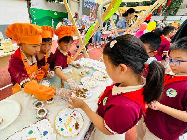 展位旁,孩子們擔任講解員,聲音響亮地介紹自己的勞動創意作品。“美食大排檔”上,皮薄餡多的餃子、軟糯香甜的粽子、香醇可口的蛋撻,散發著誘人的香氣。“小廚師”熱情為同學送上美味的食物,有的還在現場制作,忙得不亦樂乎。