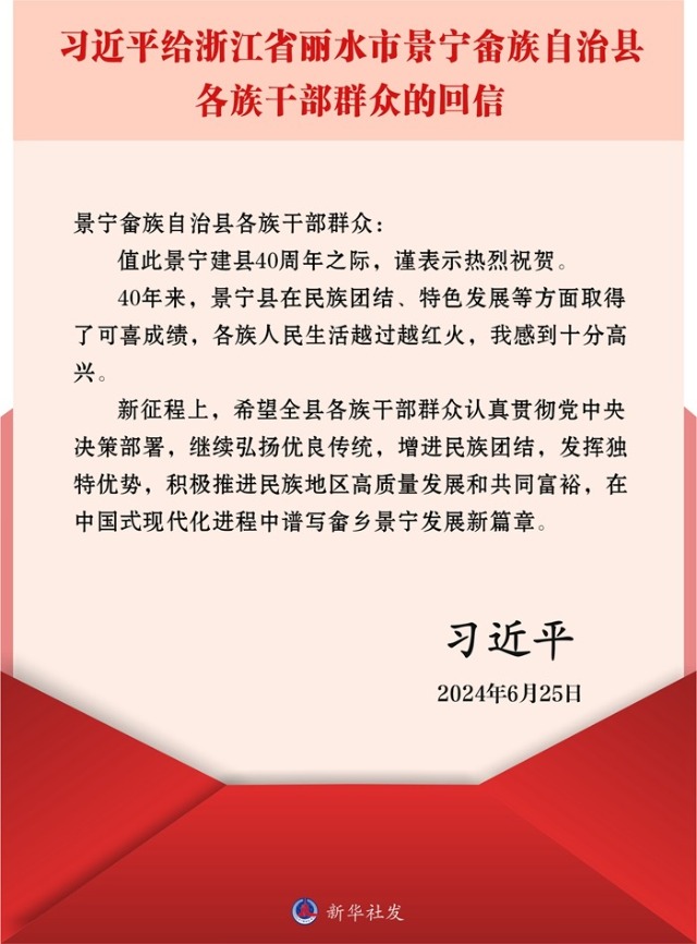 新華社北京6月26日電 中共中央總書記、國家主席、中央軍委主席習近平近日給浙江省麗水市景寧畬族自治縣各族干部群眾回信,向景寧建縣40周年表示熱烈祝賀,對景寧發展提出殷切希望。