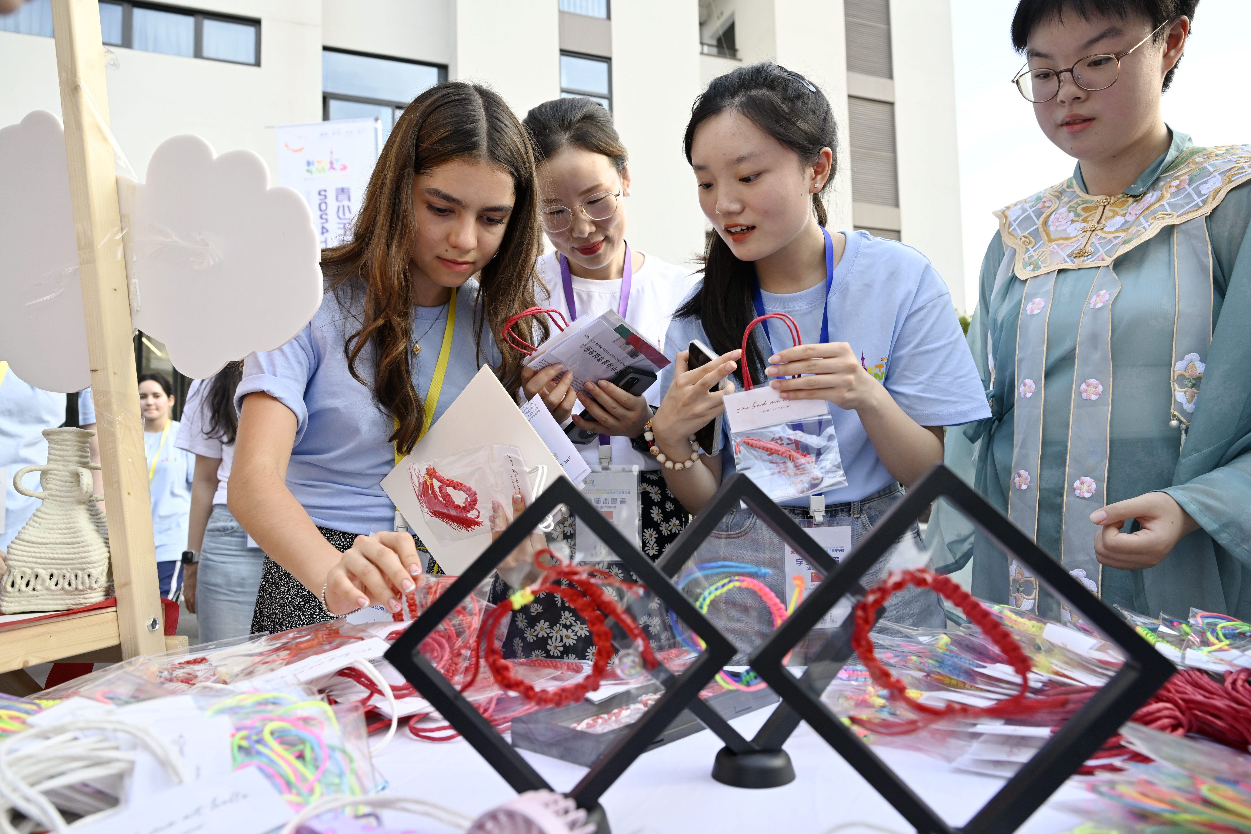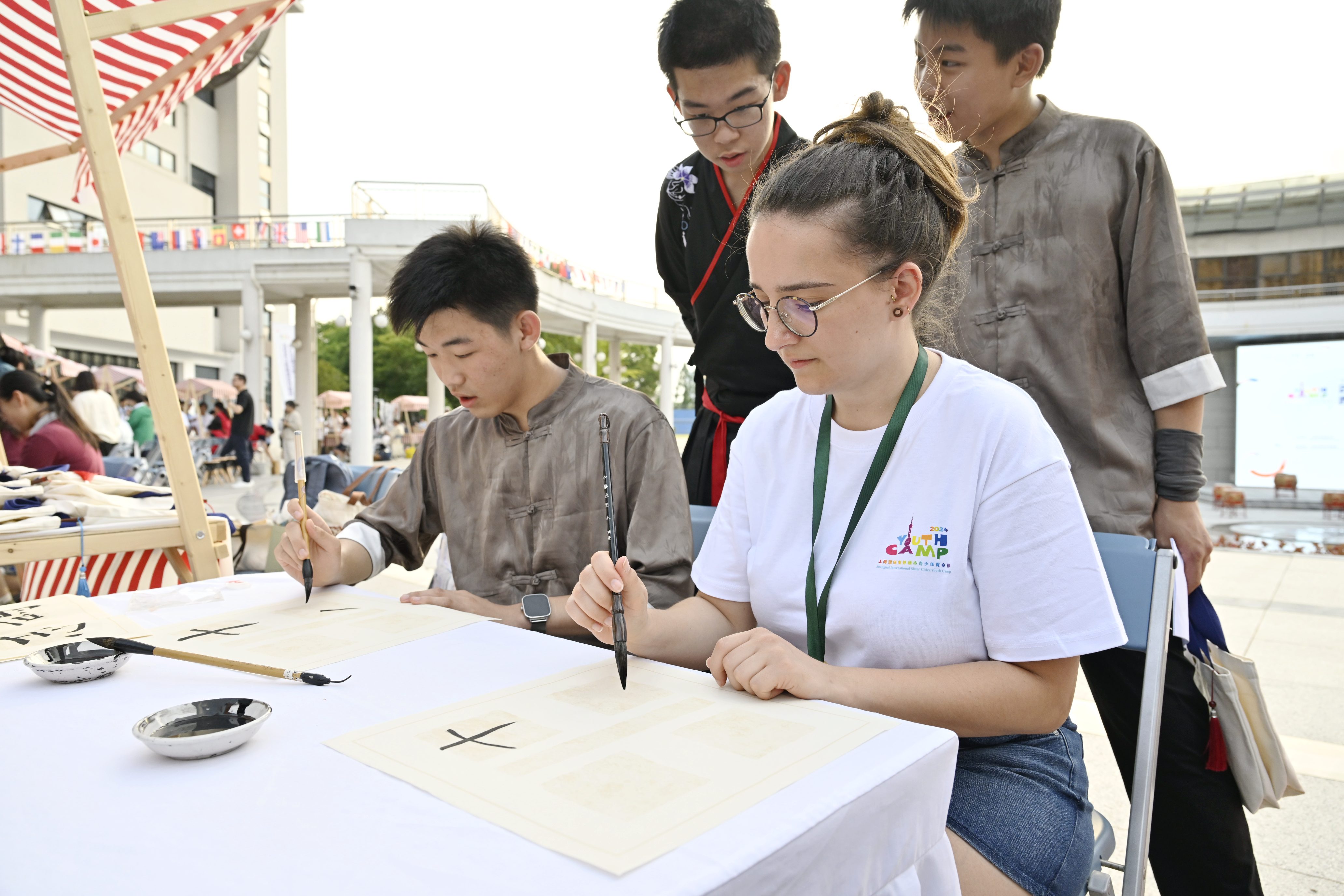 外國營員們在非遺集市上體驗非遺項目。劉曉晶攝
