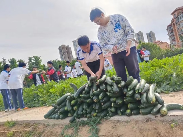 煙臺開發區高中學生收獲茭瓜。學校供圖