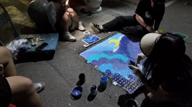 武漢學院的大學生志愿者在繪制井蓋和石墩 學校供圖
