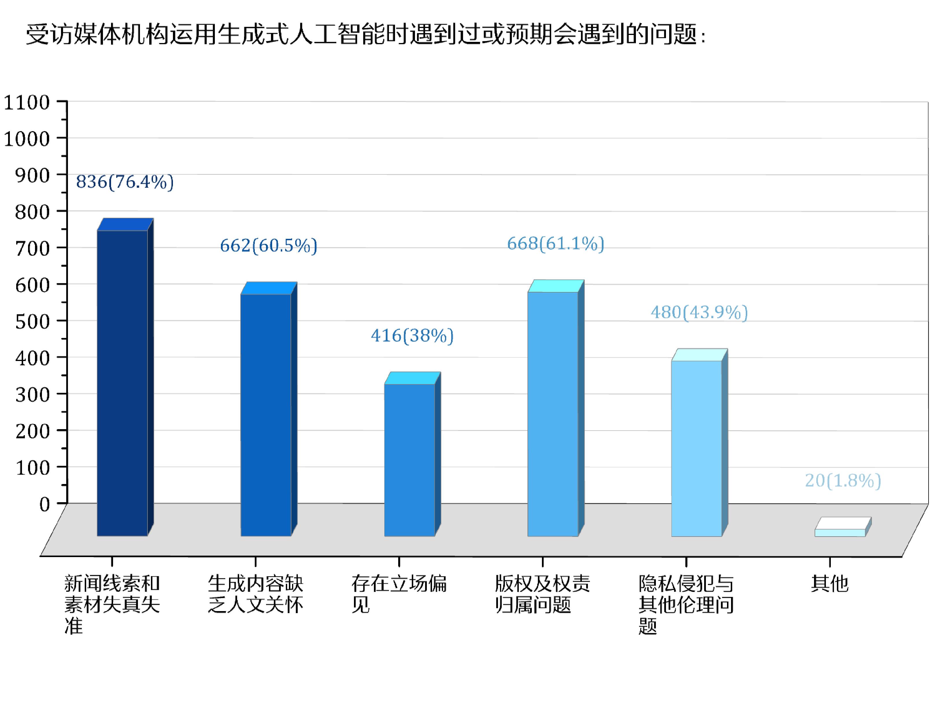多數媒體機構對生成式人工智能的應用較為審慎。對于“您所在媒體機構遇到過或預期會遇到哪些生成式人工智能帶來的問題”這一提問,高達76.4%的受訪對象表示,擔心出現“新聞線索和素材失真失準”的情況,明顯超過回答數量排在第二位的“版權及權責歸屬問題”(占比為61.1%)。