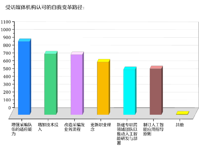 課題組調查顯示,多數媒體機構認識到,生成式人工智能正以不可阻擋之勢滲入傳媒行業,無論現在是下場共舞還是靜觀其變,媒體都面臨自我變革的壓力以適應行業變局。