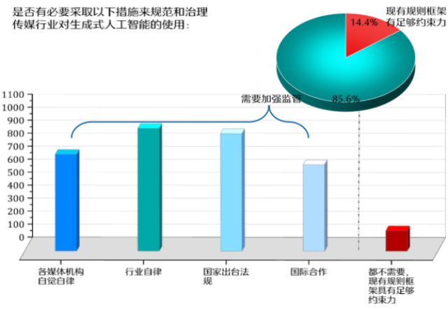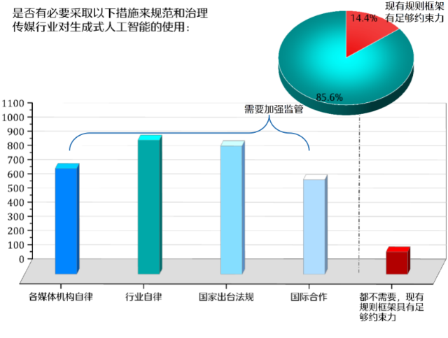 課題組調查顯示,針對生成式人工智能在傳媒行業的應用可能產生的負面效果,只有14.4%的受訪對象認為“現有規則框架具有足夠約束力”,85.6%的受訪對象都支持以某種形式加強規范與治理。