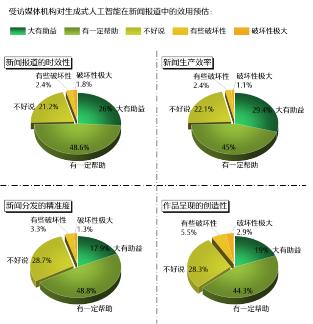 有74.6%的受訪媒體預期,生成式人工智能有助于提高新聞報道的時效性;有74.4%的受訪對象認為,生成式人工智能有助于提高新聞生產效率;預期生成式人工智能對提升新聞分發精準度和作品呈現創造性有幫助的媒體占比分別達到66.7%和63.3%。