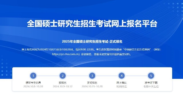 網(wǎng)上報(bào)名時(shí)間為2024年10月15日至10月28日(網(wǎng)上預(yù)報(bào)名時(shí)間為2024年10月9日至10月12日,相關(guān)工作安排由各省級(jí)教育招生考試機(jī)構(gòu)確定并公布),每日9:00-22:00。考生應(yīng)在規(guī)定時(shí)間登錄“中國(guó)研究生招生信息網(wǎng)”(網(wǎng)址:https://yz.chsi.com.cn)參加報(bào)名,按要求如實(shí)填寫(xiě)并提供真實(shí)材料。