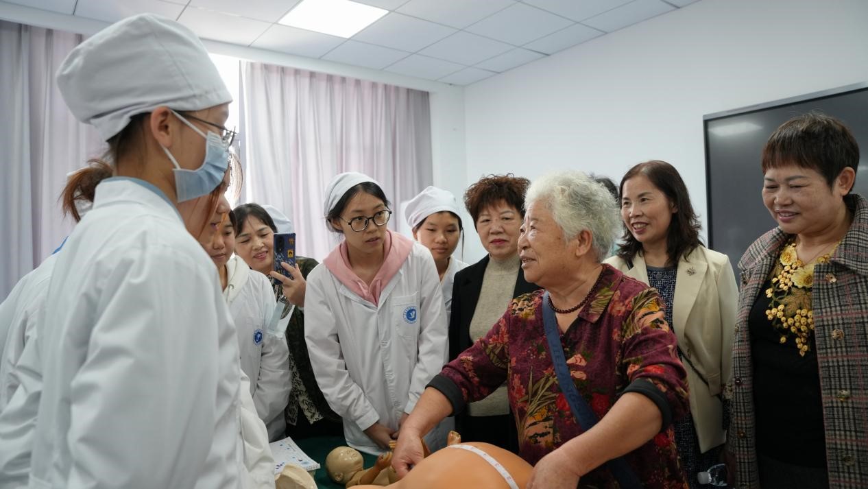 回到熟悉的課堂,退休20年的陳香蓮老師不由走上了講臺(tái),一邊利用輔助教具比畫(huà)著,一邊跟學(xué)生講述如何通過(guò)四步觸診法判斷胎兒的大小和羊水量。“在孕婦做檢查時(shí),一定要面帶微笑,動(dòng)作輕柔,就像對(duì)待你們自己的姐姐一樣……”陳老師細(xì)心囑咐道。相差整整40屆的學(xué)姐和學(xué)妹,緊緊圍在陳老師兩邊,聆聽(tīng)諄諄教誨。