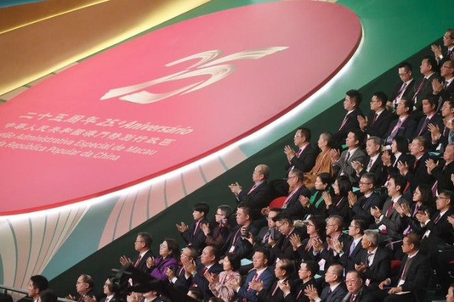 澳門東亞運動會體育館內,燈光璀璨,氣氛熱烈。慶祝澳門回歸祖國25周年大會暨澳門特別行政區第六屆政府就職典禮隆重舉行。