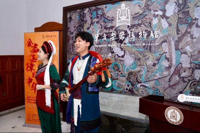 上午9點半,在上音六大歷史保護建筑之一美育樓中的東方樂器博物館里,在白族學生趙廣原、趙章利兄妹彈唱極富民族特色的歌曲《迎貴賓》后,全新策劃的“金聲玉律頌中華——2025年東方樂器博物館年展”正式開展,第一批市民觀眾走進展廳感受中華音樂之美。