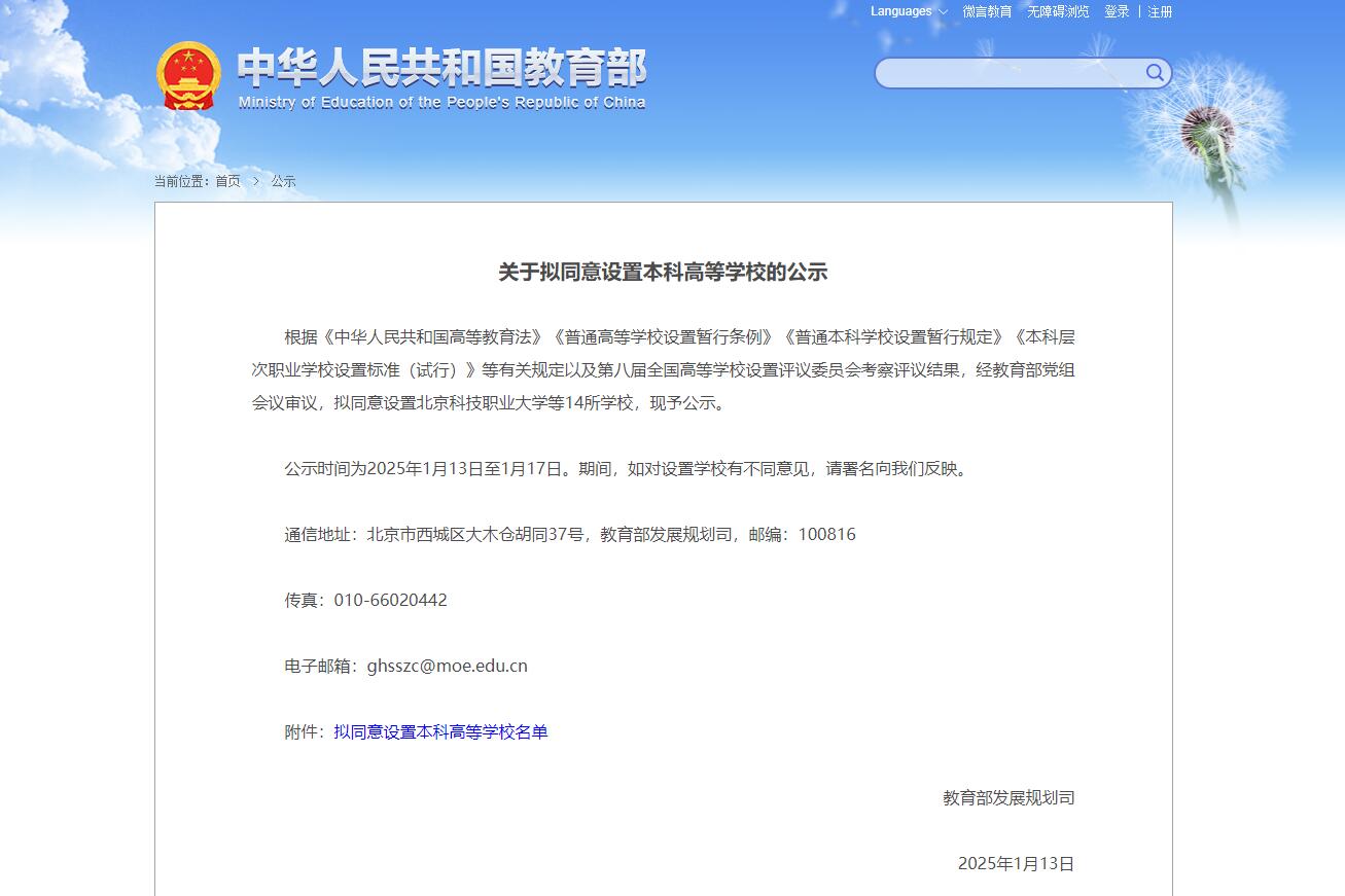 今天(1月13日),教育部發布關于擬同意設置本科高等學校的公示。