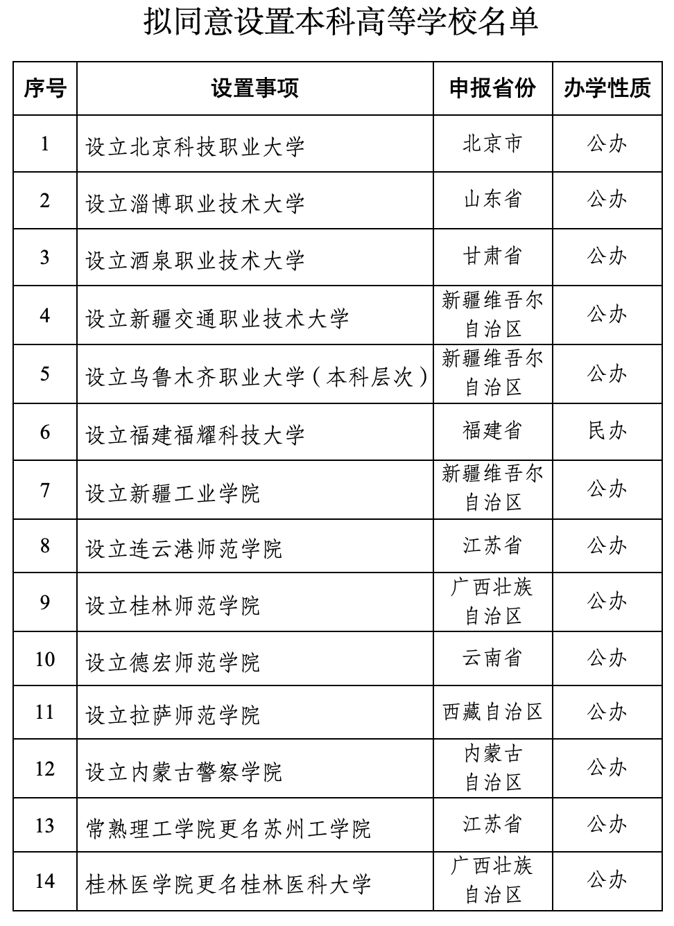 根據《中華人民共和國高等教育法》《普通高等學校設置暫行條例》《普通本科學校設置暫行規定》《本科層次職業學校設置標準(試行)》等有關規定以及第八屆全國高等學校設置評議委員會考察評議結果,經教育部黨組會議審議,擬同意設置北京科技職業大學等14所學校。