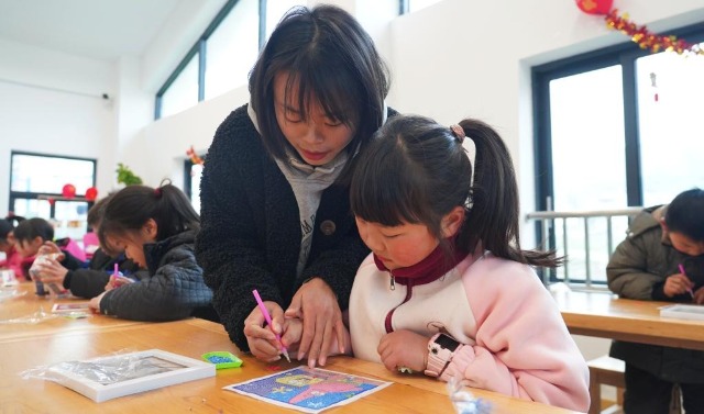 包鸞鎮“鸞媽媽”青少年家庭教育互助會的志愿者正在給孩子們上繪畫課。(王陽 攝)