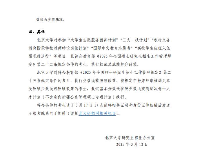 符合教育部規定并在網上報名時申請享受初試加分政策的考生可于3月14日前登錄我校采集系統(https://yz2025.bnu.edu.cn/www/ss/csjf/login)提交相關證明材料,未按規定提交材料的,不享受相應加分政策。我校根據教育部最新文件及名單審核考生資格,符合資格的考生將享受初試成績總分加分(單科不加分)。