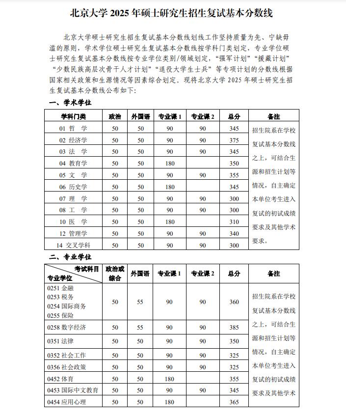 北京師范大學2025年碩士研究生招生學校復試基本分數線