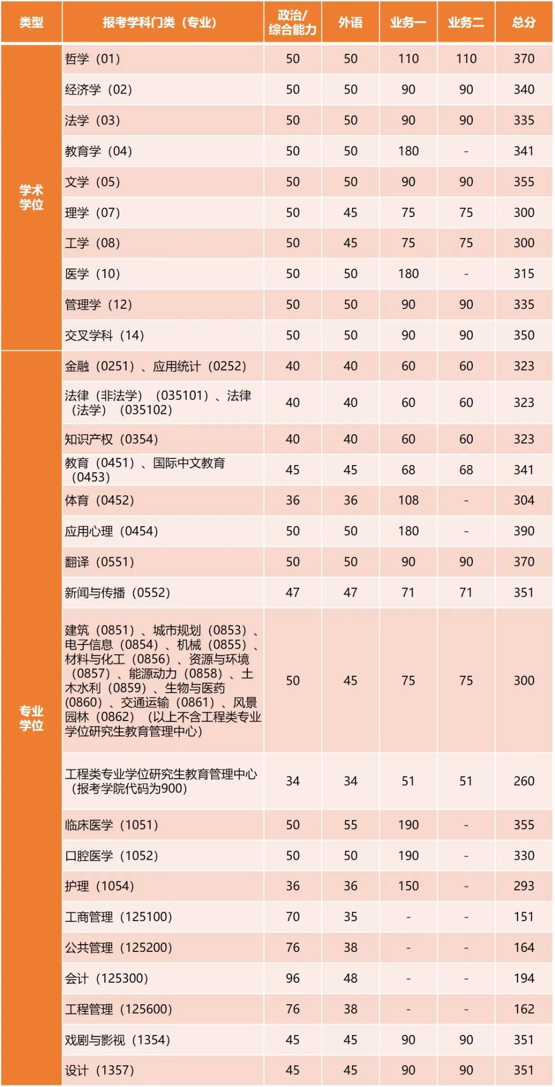報考其他學科門類的考生:滿分為100分的科目成績不低于45分,滿分為150分的科目成績不低于70分,滿分為200分的科目成績不低于90分,滿分為300分的科目成績不低于135分。
