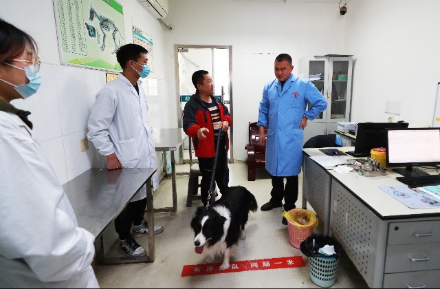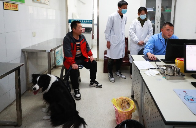 3月23日,揚州大學(xué)動物醫(yī)院。市民郜先生抱著自家的寵物狗“琪琪”前來就診。李俊醫(yī)生(右一)聽完郜先生的主訴后,讓給“琪琪”做個高頻數(shù)字式X光機檢查。