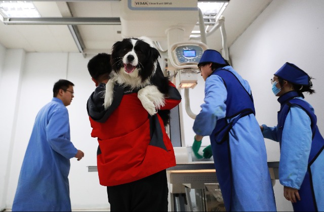 3月23日,揚州大學(xué)動物醫(yī)院。郜先生將自家的寵物狗“琪琪”抱到高頻數(shù)字式X光機檢查臺上。