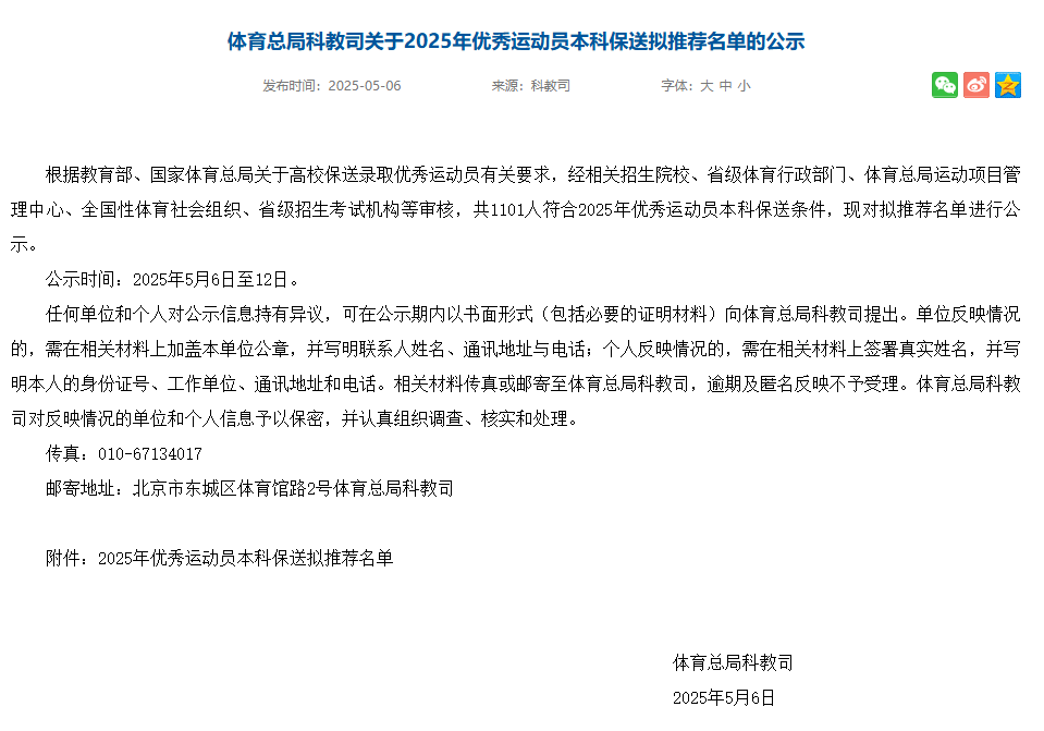 體育總局科教司關于2025年優秀運動員本科保送擬推薦名單的公示