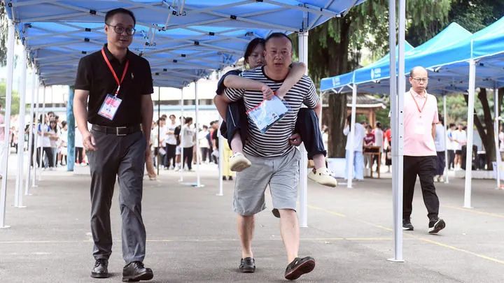 因脊髓炎導(dǎo)致下肢癱瘓的四川資陽考生蔣欣桐,通過綠色通道可提前30分鐘進(jìn)入考場,父親也被允許在旁協(xié)助進(jìn)出。