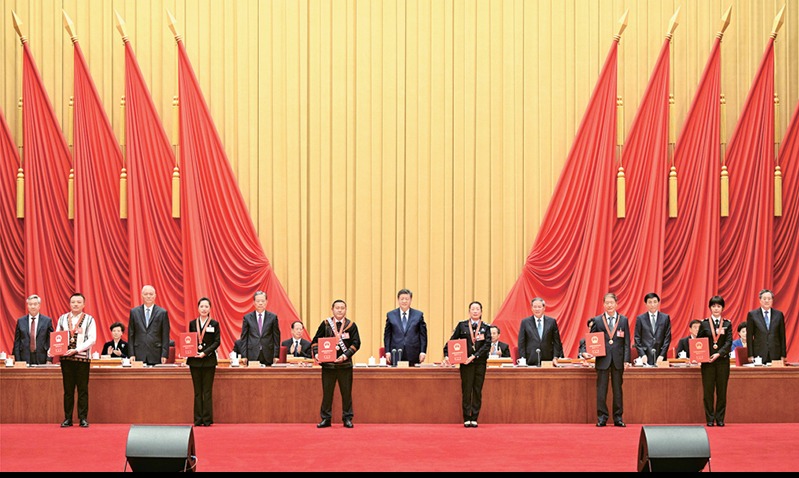 2024年9月27日,全國民族團結進步表彰大會在北京舉行。這是習近平等為受表彰的模范個人和模范集體代表頒獎。 新華社記者 李學仁/攝