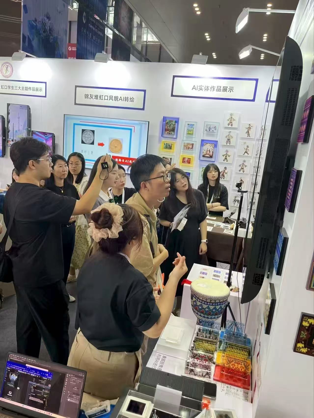 展會現場,展示了“AI+非遺”的沉浸式教學場景以及課程成果。在這里,觀眾既能近距離觀摩非遺傳承的技藝演示,感受海派文化與傳統技藝的深厚底蘊;又能在教師的專業指導下,實現文化感知與數字創作能力的同步提升。