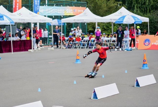 比賽現場,小小運動員們時而雙輪并行,時而單輪繞樁,雙腳如疾走的鐘擺,在極小的空間內高頻交叉、點踏、畫圈,輪子敲擊地面的脆響形成獨特的節拍,腳下的輪子化作一個個高速運轉的銀點,每一個少年都仿佛一道勁風,以嫻熟的專業技術和勇于拼搏的運動精神將現場觀眾的熱情徹底點燃。