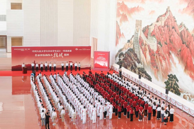 中國教育報-中國教育新聞網訊(記者 焦以璇)9月8日,“傳承和弘揚偉大抗戰精神——中國人民大學大中小學生同上一堂思政課”暨北京市學校思政課教師“同備一堂課”活動在中國共產黨歷史展覽館舉行。80名中國人民大學學生共產黨員代表、80名中國人民大學附屬中學共青團員代表、80名中國人民大學附屬小學少先隊員代表集體宣誓,以偉大抗戰精神點燃信仰之光,在紅色基因庫汲取奮進之力。