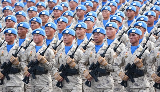 2025年9月3日,紀念中國人民抗日戰爭暨世界反法西斯戰爭勝利80周年大會在北京隆重舉行。這是維和部隊方隊接受檢閱。新華社記者 王建華 攝